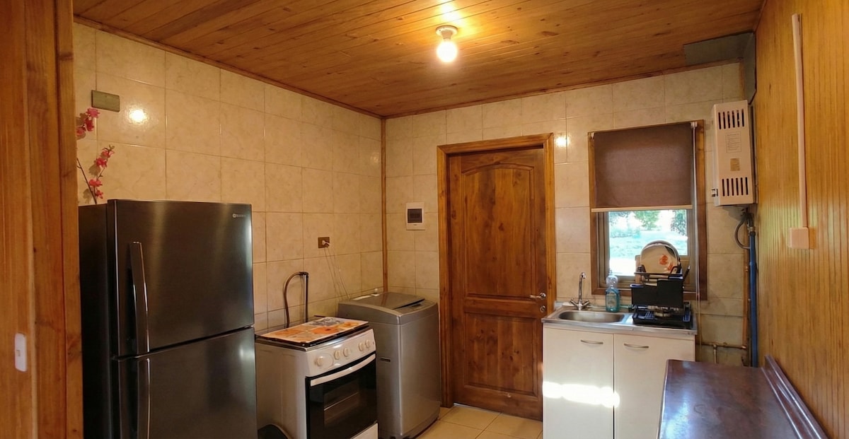 The cabin includes : Bedroom (cama matrimonial, 2 personas) Bathroom Equipped kitchen Mini fridge Main room which includes the kitchen and the living room Sofa convertible (2 person) Dining table w. 4 chairs Smart TV (no channels) Gas oven Wood heating stove Terrace Outdoor bbq pit Start pack included : Bed sheets Towels 1 Toilet paper roll Dish soap Matches 1 Trash bag (Bathroom + Kitchen) Reusable sponge 1 Kitchen towel Handsoap The water is drinkable from the tab.