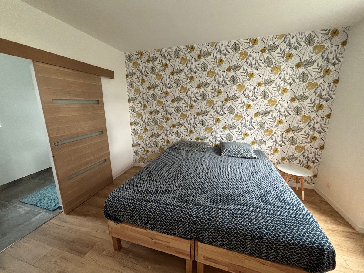 Close to the historic center of Pont l'Abbé (2-minute walk) at the entrance to the city and 10 minutes from the beaches by car. Large accommodation that can accommodate 4 people. On the ground floor, a large living room with a quality sofa bed, TV, desk, Wi-Fi, toilet, veranda (for smokers or other), an equipped kitchen (coffee, tea, sugar...), dining room, a large dressing room, a large bedroom with a king size bed, after 2 steps a bathroom with Spa and hammam, small terrace and barbecue. Free parking.