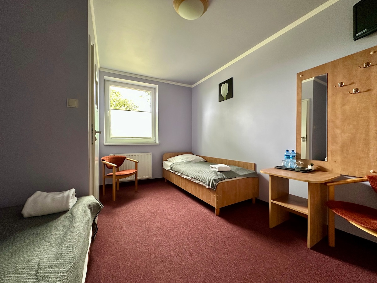 Nowoczesne, łączące minimalizm i estetykę, miejsce do wypoczynku w kameralnym obiekcie. Doskonały na prywatny wyjazd lub służbowy pobyt - sprawdzi się jako miejsce pracy. Pokój wyposażony w klimatyzację, prywatną łazienkę i dwa pojedyncze połączone ze sobą łóżka tworzące łoże typu King. Standardowo pokój przygotowany jest w tej formie. Jeśli życzysz sobie aby na Twój pobyt pokój posiadał dwa pojedyncze łóżka z przyjemnością spełnimy Twoją prośbę. Minimalizm, komfort i wygoda to nasz priorytet.