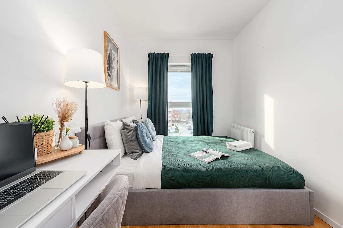 This spacious apartment features three comfortable rooms, making it ideal for families or groups of friends. The bright and airy living area is perfect for relaxing after a day of exploring the city The kitchen is fully equipped with all the essentials, allowing you to prepare meals with ease. You'll have the convenience of a dedicated parking space, making it easy to explore Łódź and its surroundings by car Our apartment provides the comfort and amenities you need for a delightful stay in Łódź