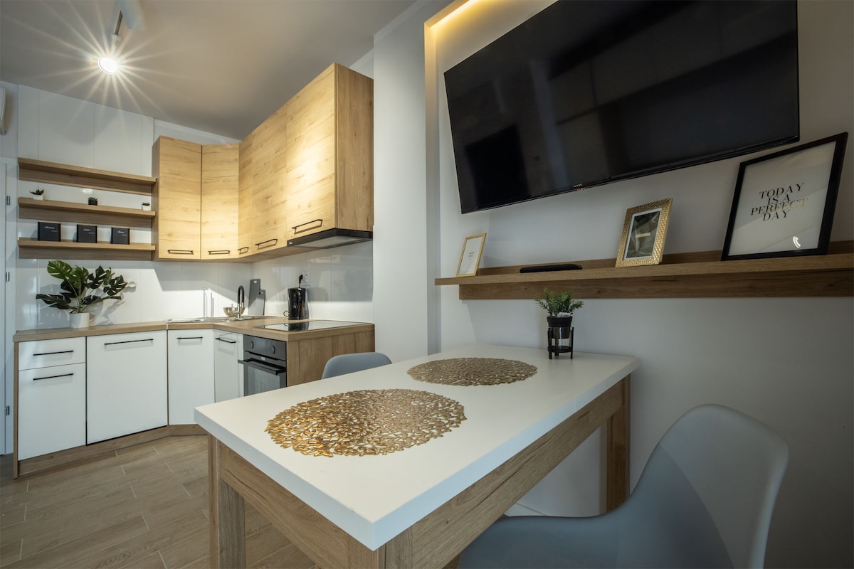 Miejsce położone w centrum - czeka na Ciebie spokój i komfort. Luksusowy apartament z dwoma sypialniami, salonem, kuchnią łazienką oraz dużym tarasem jest wyposażony we wszystko co potrzebne do krótkiego i długiego pobytu. Na przeciwko jest centrum Manufaktura ze sklepami, restauracjami, kinem, ścianką wspinaczkową, siłownią. Park Staromiejski 800m. Parking na terenie zamkniętego osiedla bezpłatny. Doskonałe miejsce na bazę noclegową do zwiedzania miasta oraz pobyt biznesowy.