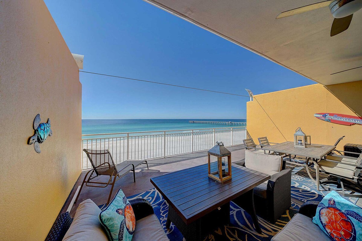 This GULF FRONT BEACH condo has a style all its own. Long Beach is a gated community and features the longest stretch of sand in PCB. This newly renovated condominium on the 7th floor has panoramic views of the Gulf from every room . Spanish-style ceramic tile floors & premium granite countertops throughout. The huge curved balcony attracts spectacular sunsets. The resort has low occupancy so the super-fast elevators won't leave you waiting. The resort has a 25 yo age minimum in order to book.