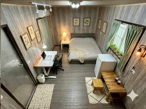 The stable house covers an area of 300 sq. ft. and is 85 sq. ft. in size, with a Spanish-style exterior. The pink-orange exterior walls, combined with handmade wall lines, make you feel like you're back in your childhood. You can play in the yard as much as you like, and of course you can daydream or ride a bike around the house, which is my favorite thing to do. You can also take a walk or ride a bike in the park next to the Hope Hall, where there are also bicycles for rent!There is also a 7-11 convenience store, so it is very convenient to live here.