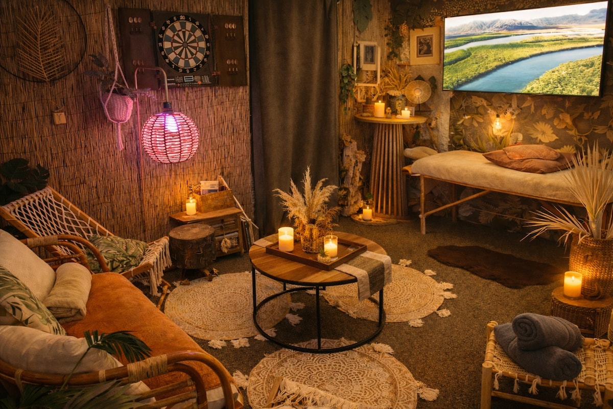 ✨ Découvrez le Mirage Tropical , une parenthèse raffinée au bord de la Loire 🌴. Profitez d’un Spa , Table de Massage d’une terrasse élégante et d’un espace jungle dépaysant pour vous évader. Amusez-vous autour du jeu de fléchettes, partagez un apéro exotique ou détendez-vous dans une atmosphère unique. Le soir venu, la chambre s’illumine de couleurs envoûtantes pour un moment chic et romantique 💖. Ici, chaque détail sublime votre séjour pour créer des souvenirs mémorables.🌴❤️❤️💕💕💕👄🫂❤️