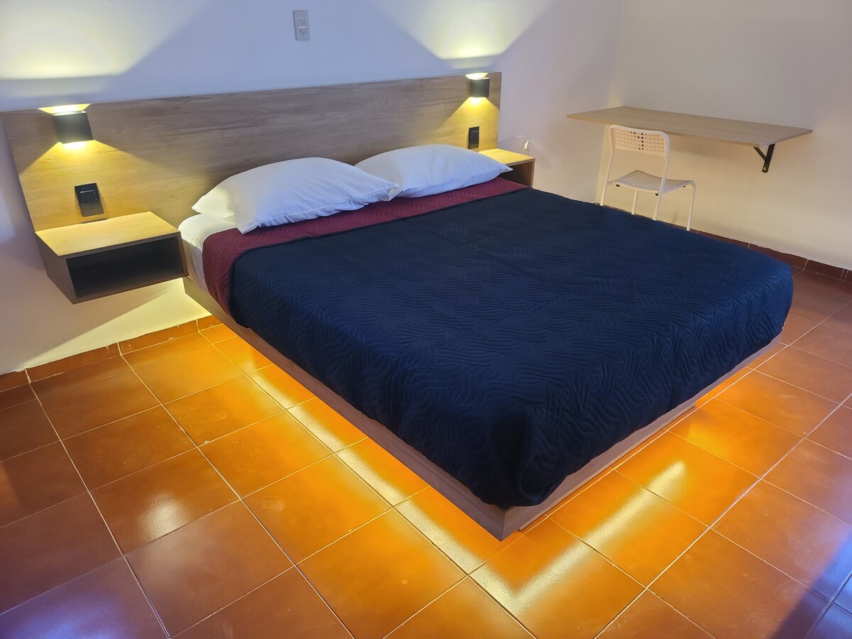 La suite esta equipada para brindar el mayor confort. Descanse en sus camas con colchón memory foam mientras ve una película en la smart TV, WIFI alta velocidad. Disfrute de un buen baño en una regadera con acabados de alta calidad. Contamos con servicio de aire acondicionado para tu mayor comodidad con un costo de $150MXN por 1 noche , mas de 7 noches $100 MXN por noche, mas de 30 noches $66 MXN por noche.