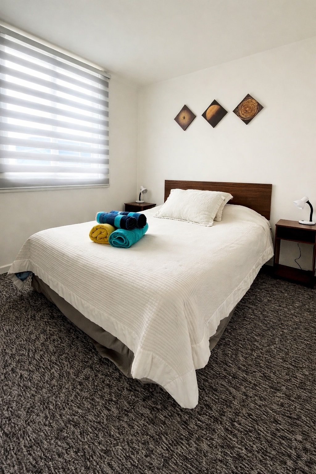 Cálido y moderno departamento, ubicado en el corazón del mejor barrio de Osorno, seguro, cerca del centro, con fácil acceso a supermercados, restaurantes y tiendas. Full equipado y buena calefacción. Estacionamiento privado. Los huéspedes tienen acceso a una piscina compartida, gym y sala de juegos. El edificio cuenta con conserje las 24 horas asegurando una estadía tranquila y sin preocupaciones. Check in autónomo y entorno con jardines y naturaleza.