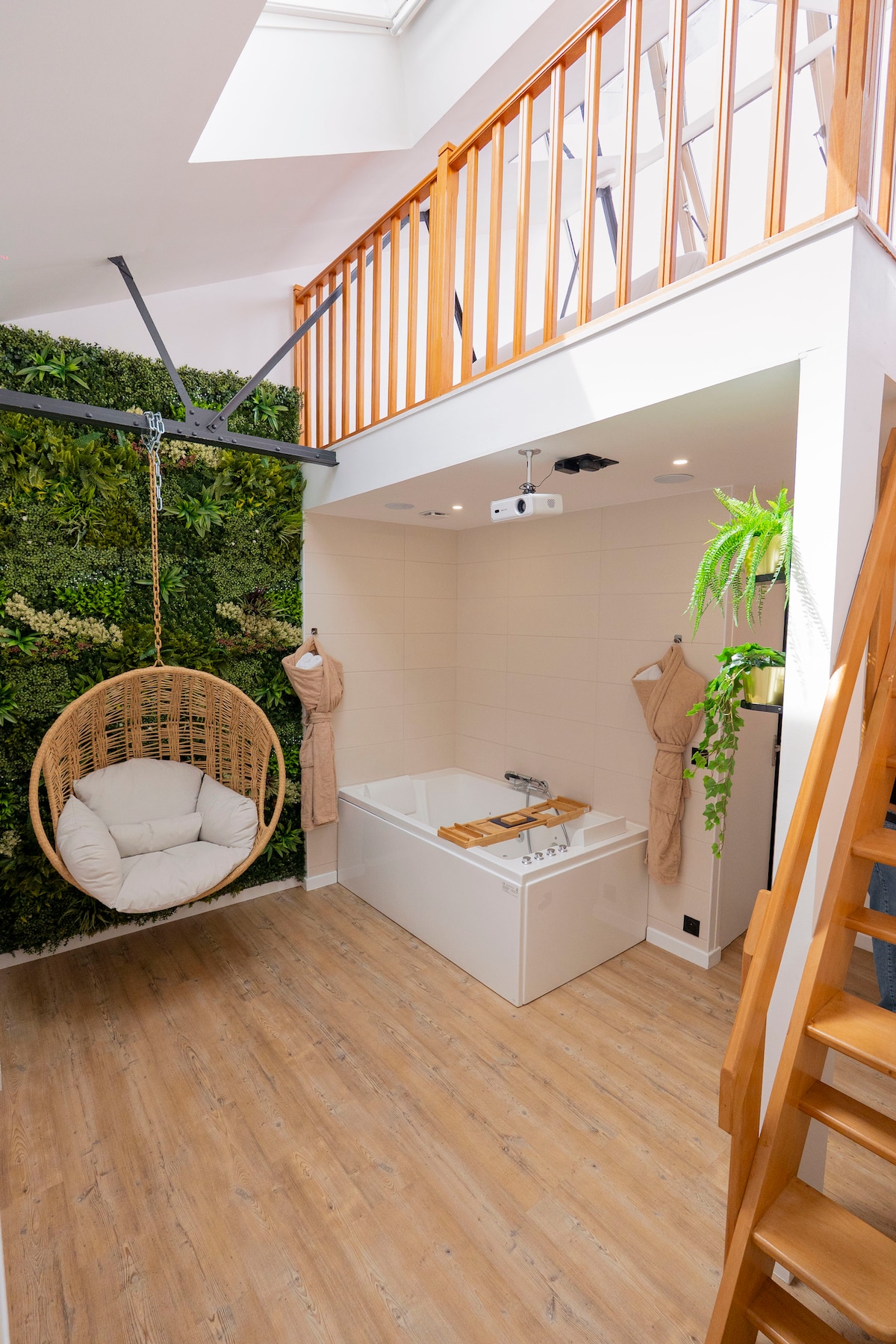 Beautiful renovated triplex loft in the heart of Le Mans. Modern and warm, it offers a wellness area with a spa, a green wall and a hanging chair. Cozy living room with soft sofa and refined decor, fully equipped kitchen. Bright and comfortable mezzanine bedroom under the rooftops. Contemporary bathroom with walk-in shower and double sink. Ideal for a break of comfort, style and relaxation.