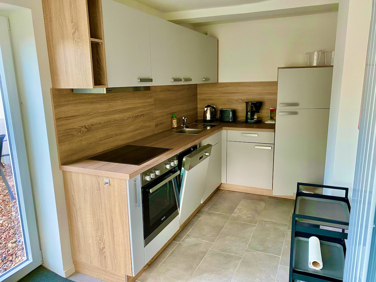 Vacation home in the countryside with attention to detail (56 square meters), view over fields, horse paddocks and forest - no holiday village ghetto ;-) 25 sqm terrace facing west with spectacular sunsets, alternatively a cozy fireplace and fast Wi-Fi for bad weather 2 minutes to the forest, ideal for dogs, forest walks or mountain biking For the kids: playground, swimming pool and zoo within 5 minutes All in: No extra costs for dogs, additional people (max 4), towels or bed linens