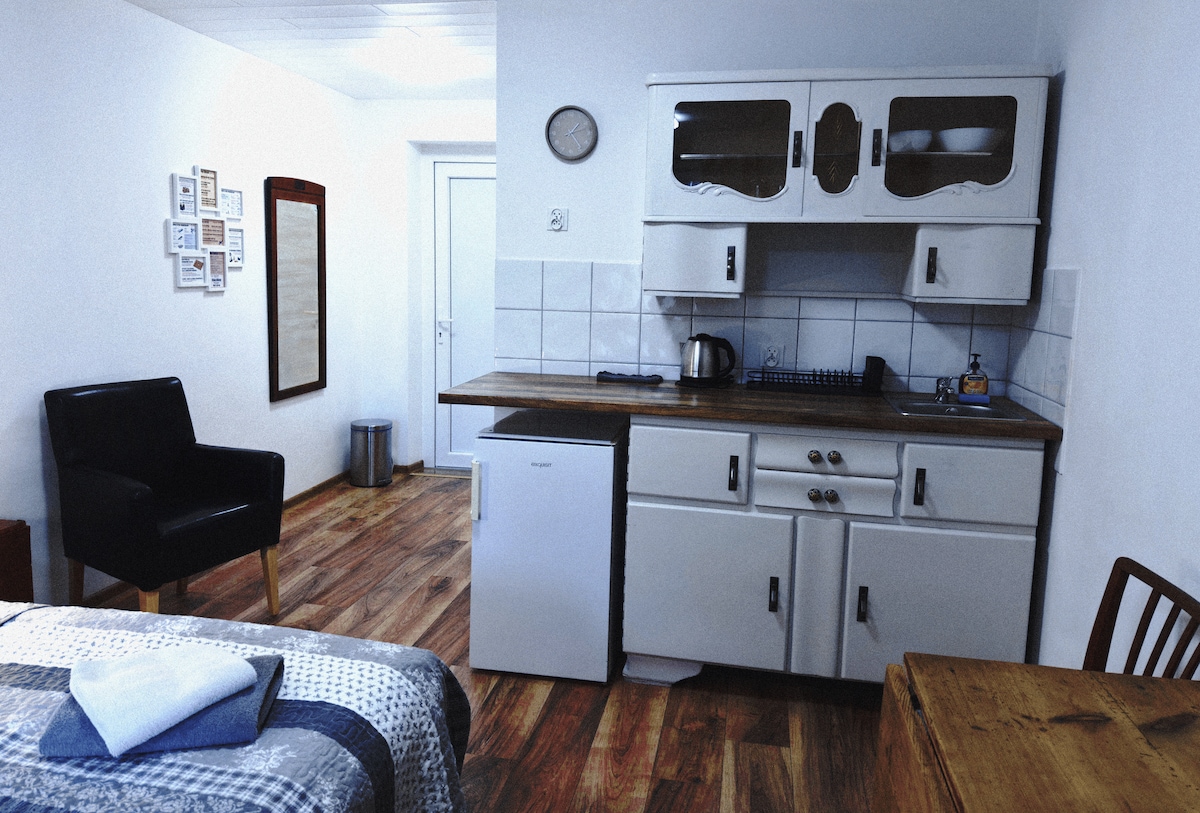 A 3-person cottage with 1 bedroom with a double bed and an additional bed suspended on the upper floor. In addition, the possibility of sleeping in the living room on a comfortable corner sofa – a maximum of 2 people. For each additional person in the cottage, PLN 60/person/day. Children under 7 years of age are not counted in the number of people in the cottage - the maximum number of all people in the cottage is 5. In addition, the price includes the use of the swimming pool, sauna, hot tub, bicycles and water recreation equipment.