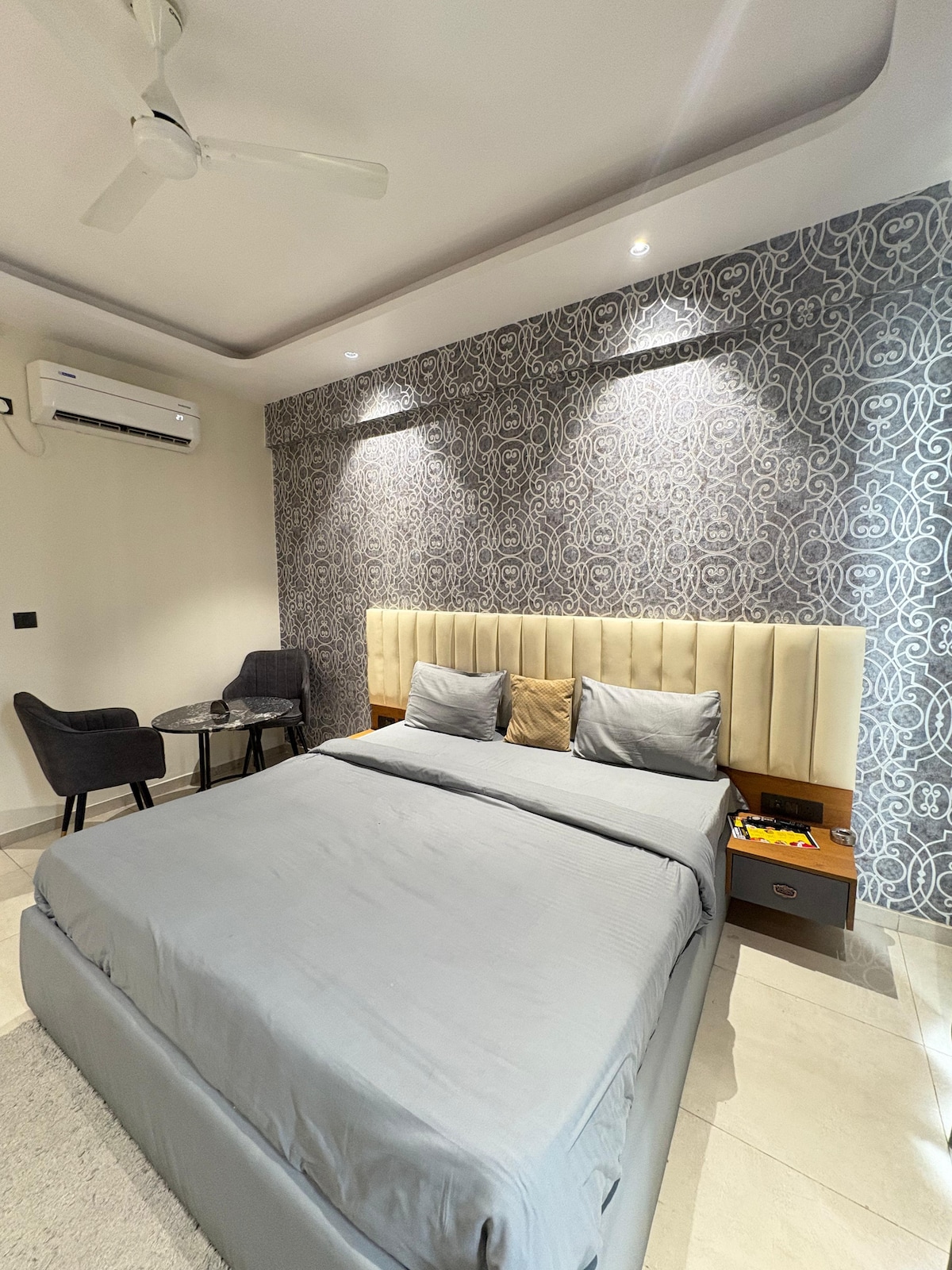 A modern, well-designed space with a calm and elegant vibe. The bedroom features a large comfortable bed, soft lighting, and a striking moon-themed backlit wall that adds a unique, cozy feel. The false ceiling and neutral tones enhance the premium look. The bathroom is clean and contemporary with marble-style tiles. A compact kitchenette with storage, sink, fridge, and essentials makes the stay convenient and comfortable.