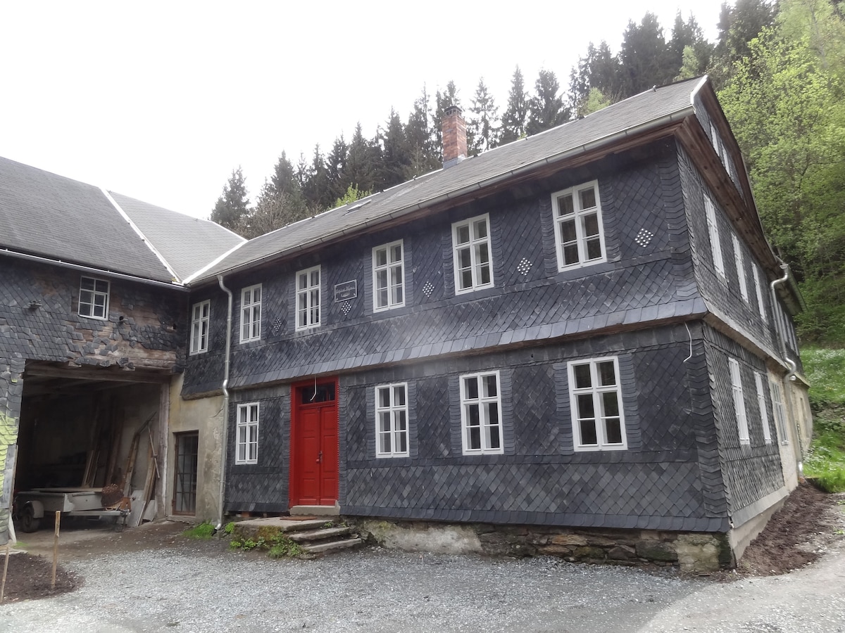 Secluded slate mill with a manor house and barn on a small stream next to a huge clearing not far from Kronach. Carefully renovated in the last three years, furnished exclusively with old furniture, converted Bohemian cross-vaulted stable to 80 sqm large kitchen-living room. Bread oven, casement windows, central heating. Butterflies without end, fireflies, the black stork ... Together with the newly renovated Gesindehaus right next door, it can accommodate over 22 people.