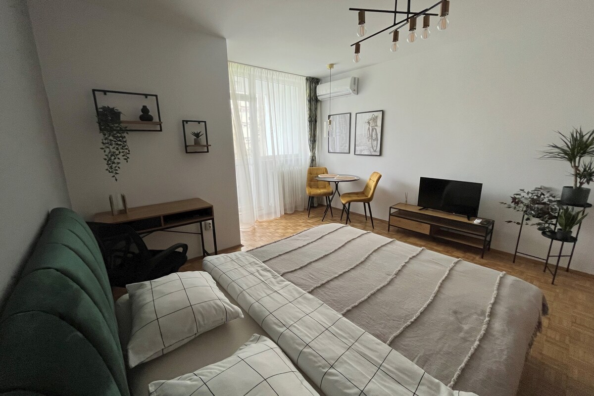 Welcome to our brand new one-bedroom apartment in Cluj Napoca, just 2 km from the city center! Perfect for solo travelers, couples, or small groups, this stylish space features a comfy double bed, an expandable couch, a fully equipped kitchen, Smart TV with cable& Netflix, and a beautifully furnished bathroom. Come enjoy a cup of coffee on the house while you take in the peaceful surroundings from the terrace. Private parking and self-check-in are included. We look forward to hosting you!