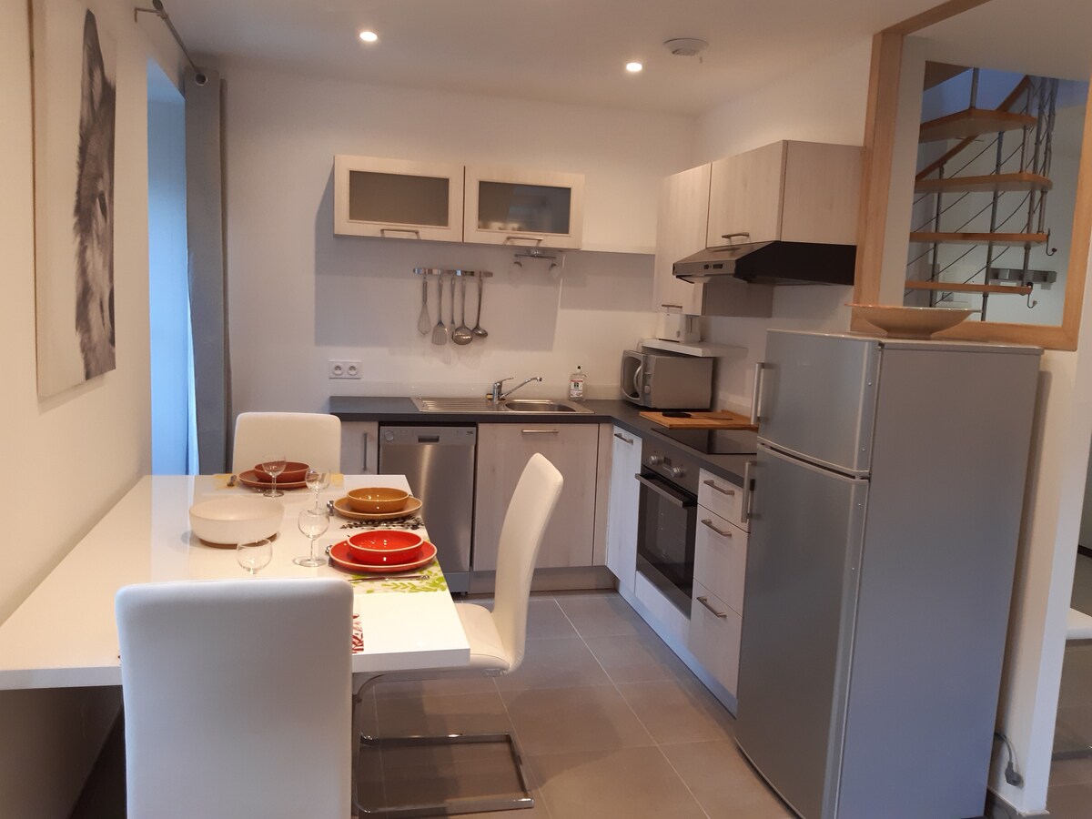 100% cocooning apartment, located on the second floor of a small building. Quiet location while being located in the heart of the village, with ample non-private parking. A cozy nest of 35 m2 for 4 people, warm and refined. 100 m2 of terrace and private garden. Sleeping arrangements: 1 bedroom with a 140 x 190 bed and a large dressing room, sofa bed with a real 140 x 190 mattress. Beds made on arrival. Fully equipped kitchen. Bathroom with shower, separate toilet. Bath towels provided.