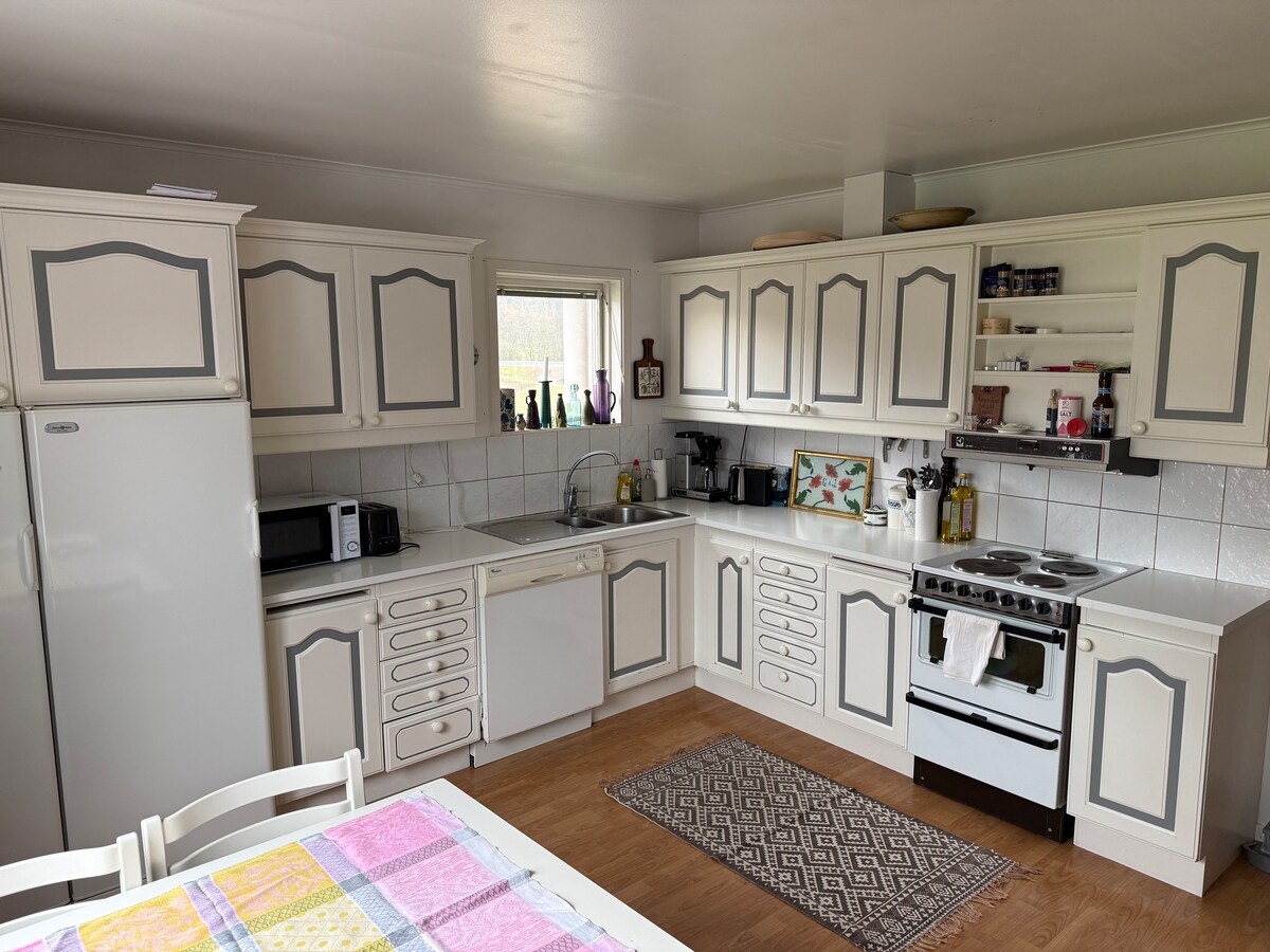 The house and surroundings are especially suitable for families with children, hikers and sport fishermen. Rural, scenic and quiet location. Close to nice fishing spots for sea trout and mackerel. Undisturbed plot with large lawn, climbing trees and rocks. Sandbox, soccer goal and trampoline. Sunny patio with barbecue grill. Fire pit for open fire. Short walk to jetties, small beach and crab fishing. Two hiking trails nearby. Sheep, chickens and rabbits, 2 kayaks and small motorboat for rent. Fast wi-fi. Host family in the neighboring house.