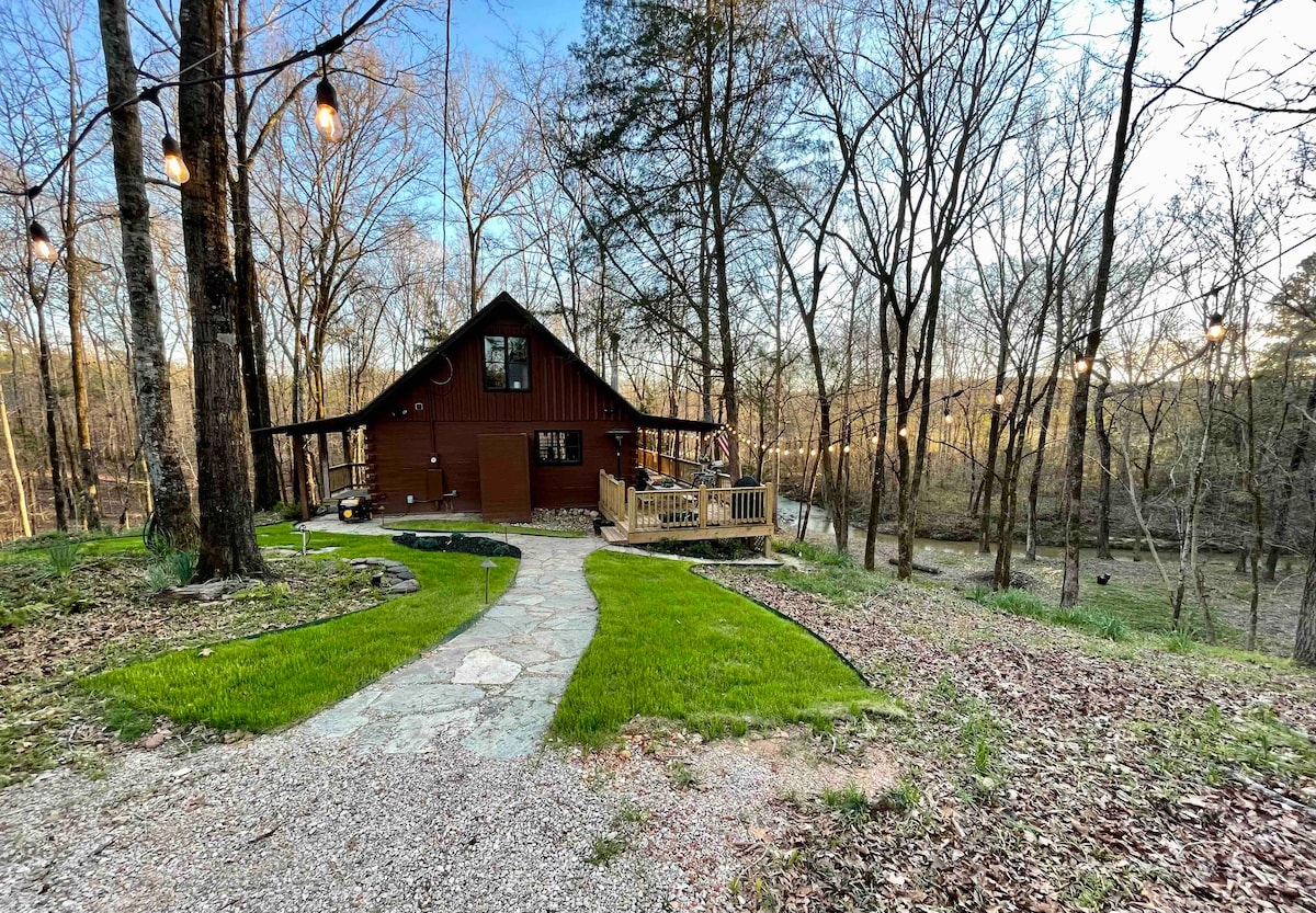 Take it easy at this unique and tranquil getaway. A rustic cabin with modern amenities. Located on a private farm, just outside of Auburn. 3 bedrooms and 1 bathroom. Additional outdoor shower. 2 queen beds and 2 full size beds. Hi speed internet. Indoor wood burning fireplace along with outside fire pit and hot tub. Beautiful spring fed creek with the sound of running water that can be heard from wrap around porch. Gated entrance with over a mile of trails. About 10 minutes to Auburn campus.