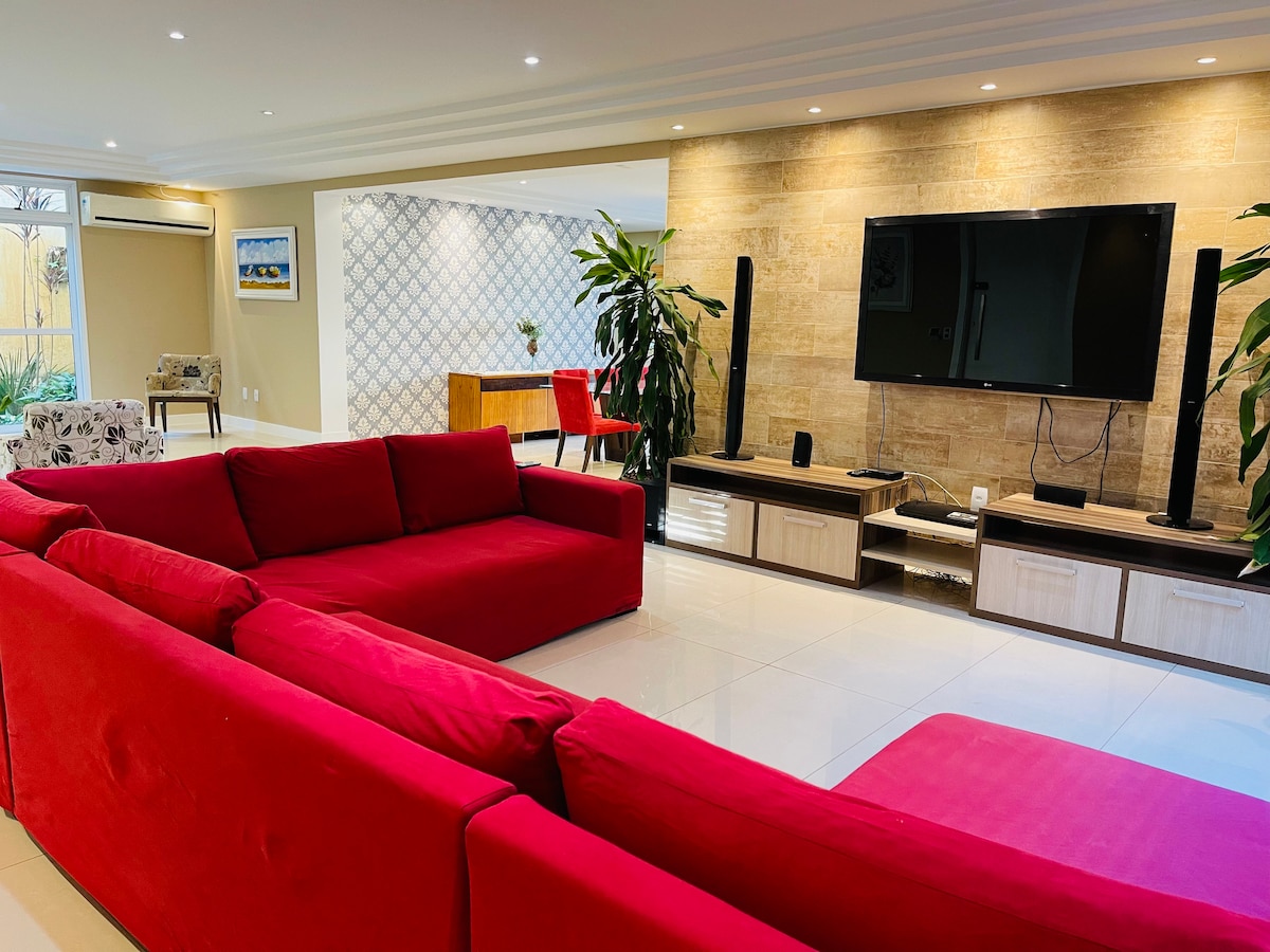 Ponto turístico do RJ, condomínio Barra Bonita, atras do Recreio Shopping onde temos varias lojas de todos os tipos, para vários gostos, inclusive ha o mercado Pao de Acucar no shop, farmacia, tendo acesso a pe, nas proximidades ha uma praca também para exercícios ao ar livre, e próxima a praia do Recreio, casa com decoração de luxo e conforto. Ambiente familiar!