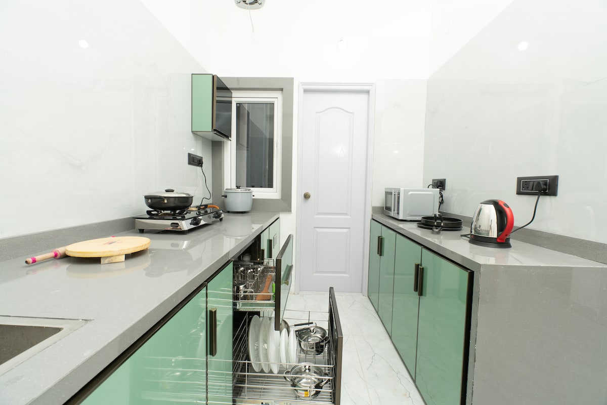Welcome to our stylish 3 BHK apartment, ideal for short or long stays. Enjoy 3 AC bedrooms with attached baths, a cozy living room with a 43" Smart TV, high-speed Wi-Fi, and an indoor swing. The fully equipped kitchen includes a gas stove, microwave, RO purifier, fridge, and utensils. Conveniently located near Hitech City Metro, Usha Malpuri's Kitchen (100 m), US Visa Center (1 km), Cable Bridge, and major IT hubs..