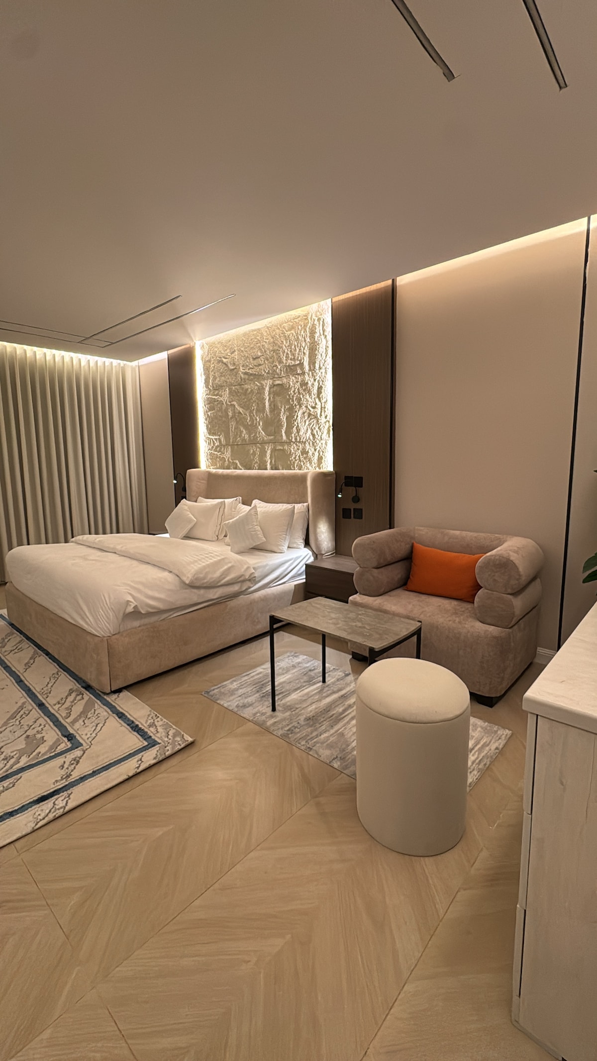 Enjoy a unique experience in a private bedroom that provides relaxation and comfort. The apartment includes a bed and a living area where you can enjoy watching on a 55-inch smart screen. There is also a kitchen and coffee to cater to all your needs. Hotel bedroom, smart access, comfortable design 5 minutes walk to Al-Ahsa Mall 5 minutes walk to King Abdullah Park 10 minutes by car to King Faisal University 10 minutes by car to the Faculty of Arts 10 minutes by car to Al-Ahsa International Airport 15 minutes by car to the train station Cafes are close to restaurants Comfortably designed studio Luxury finishing