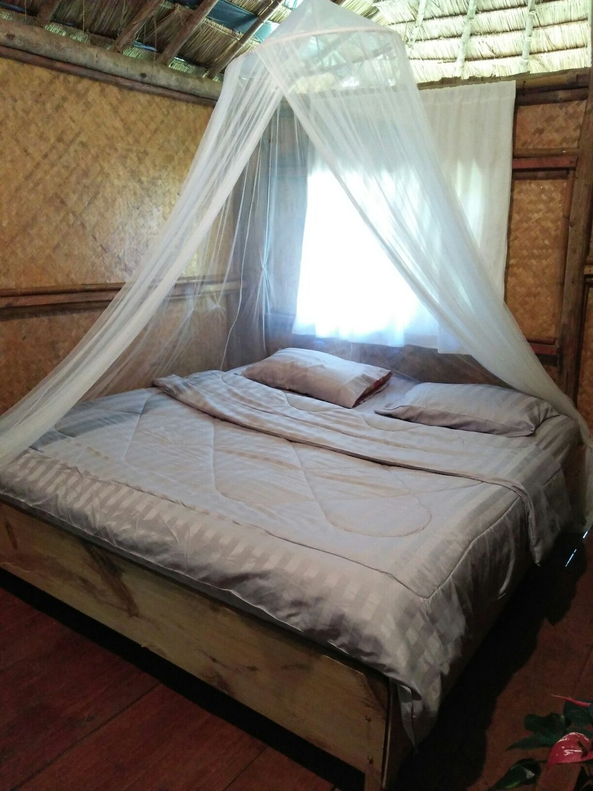 our bungalow is bamboo houses,the huts feature traditional grass roots. near the Karen hill tribe village, views of the jungle, a clam and peaceful camping - ground surrounded by waterfall,river and mountain. the house is suited for couples or friends with a gueen size bed and can add in 2 extra bed for family. you can book day trips and stay overnight.