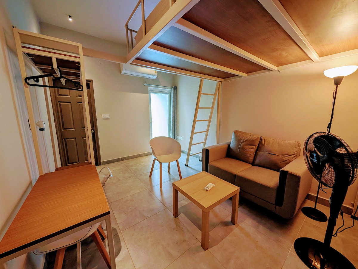 Zen living at Shambala - A loft style minimal modern living space. With large/airy rooms, balconies and a fully equipped kitchen. Enjoy the breathtaking golden hour(sunset) from the balcony and immerse yourself in the slow life embracing the depth of each moment. Shambala is the perfect for the ones seeking a soulful experience. Apt. Details: Room 01 - AC / Balcony Room 02 - AC