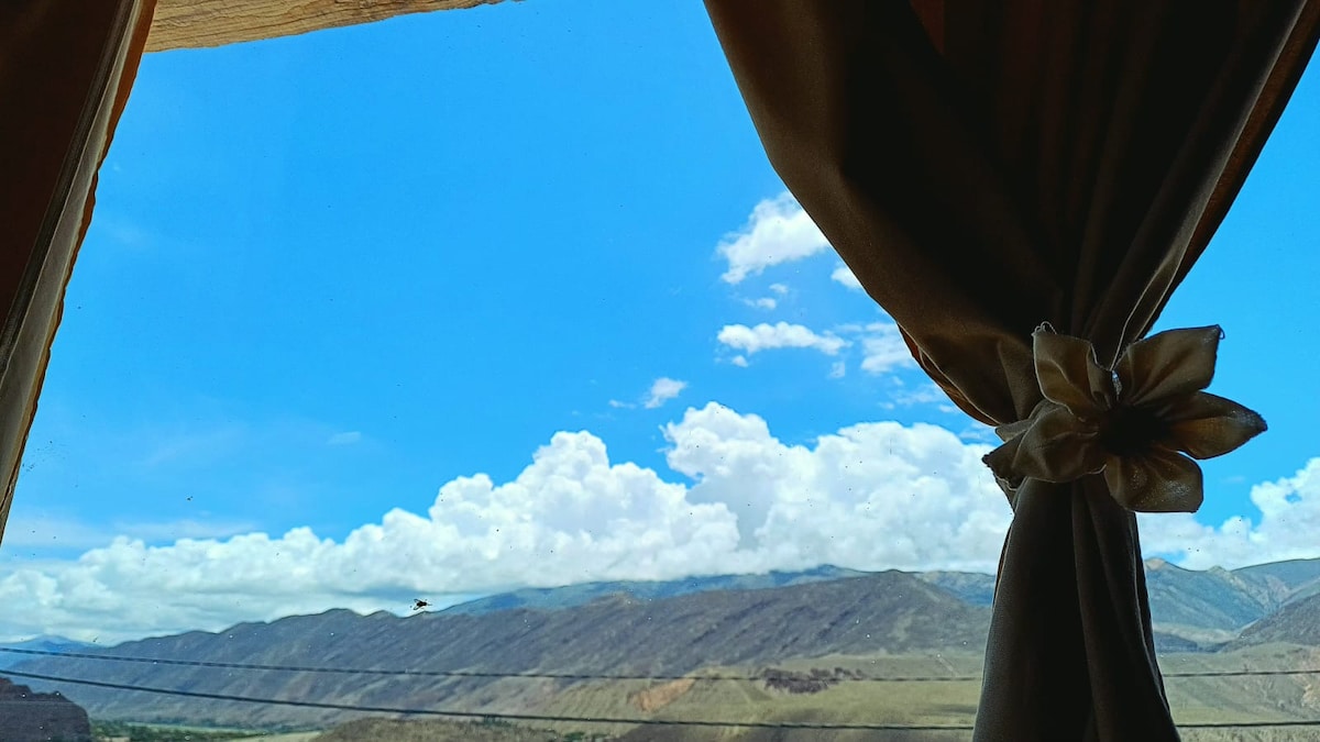 Esta habitación privada, junto a otras 3, está a 2 km del centro de Tilcara. Construida con materiales de la zona y en un estilo rústico: adobe, madera y cañas y barro. Se caracteriza por su hermosa vista hacia las montañas y la tranquilidad. Concebida ecológicamente, hacemos reuso de aguas para riego, tenemos calefones solares y separación de residuos.