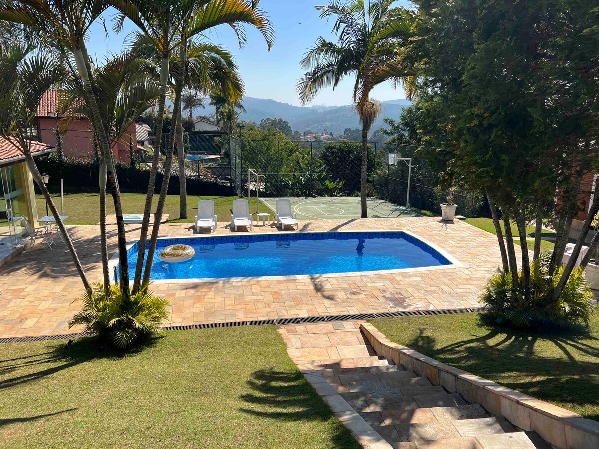 Country house, with complete leisure for adults and children, 50 minutes from São Paulo - Capital. Spacious and comfortable house for up to 15 people, 6 suites and balconies. If you need to accommodate 17 people, CONSULT US. Spacious, comfortable gourmet area with refrigerator, brewery, barbecue and wood-fired pizza oven. Ideal to enjoy with family and friends in the summer, enjoying the pool, or in the winter, enjoying the fireplaces.