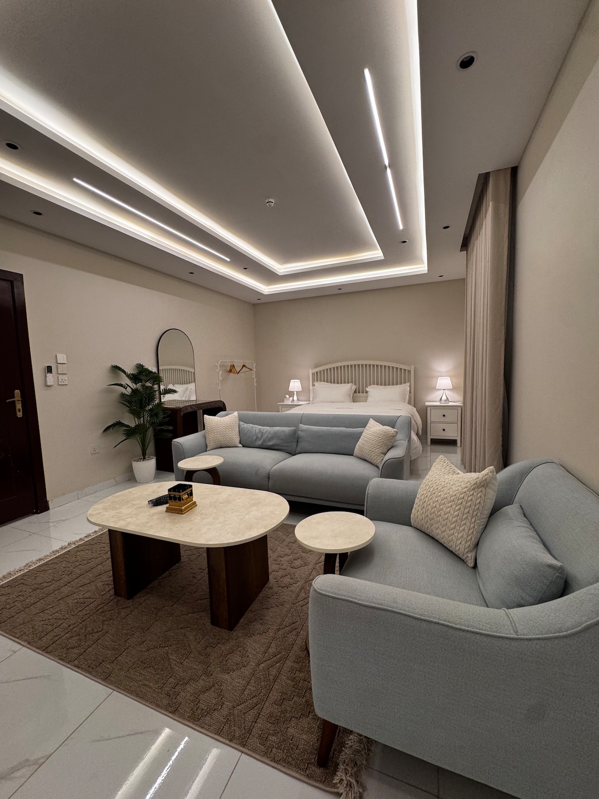 A spacious and quiet studio, with a large bed in the middle that gives a feeling of comfort, and next to it an elegant sitting area with a comfortable sofa and a simple side table. The place is practically and clearly coordinated, and its lighting is nice, giving it a warm and comfortable feel. 1.9 km from Kadi parking, the nearest bus station is 100 m away, 500 m from the Bataha Quraish walkway.