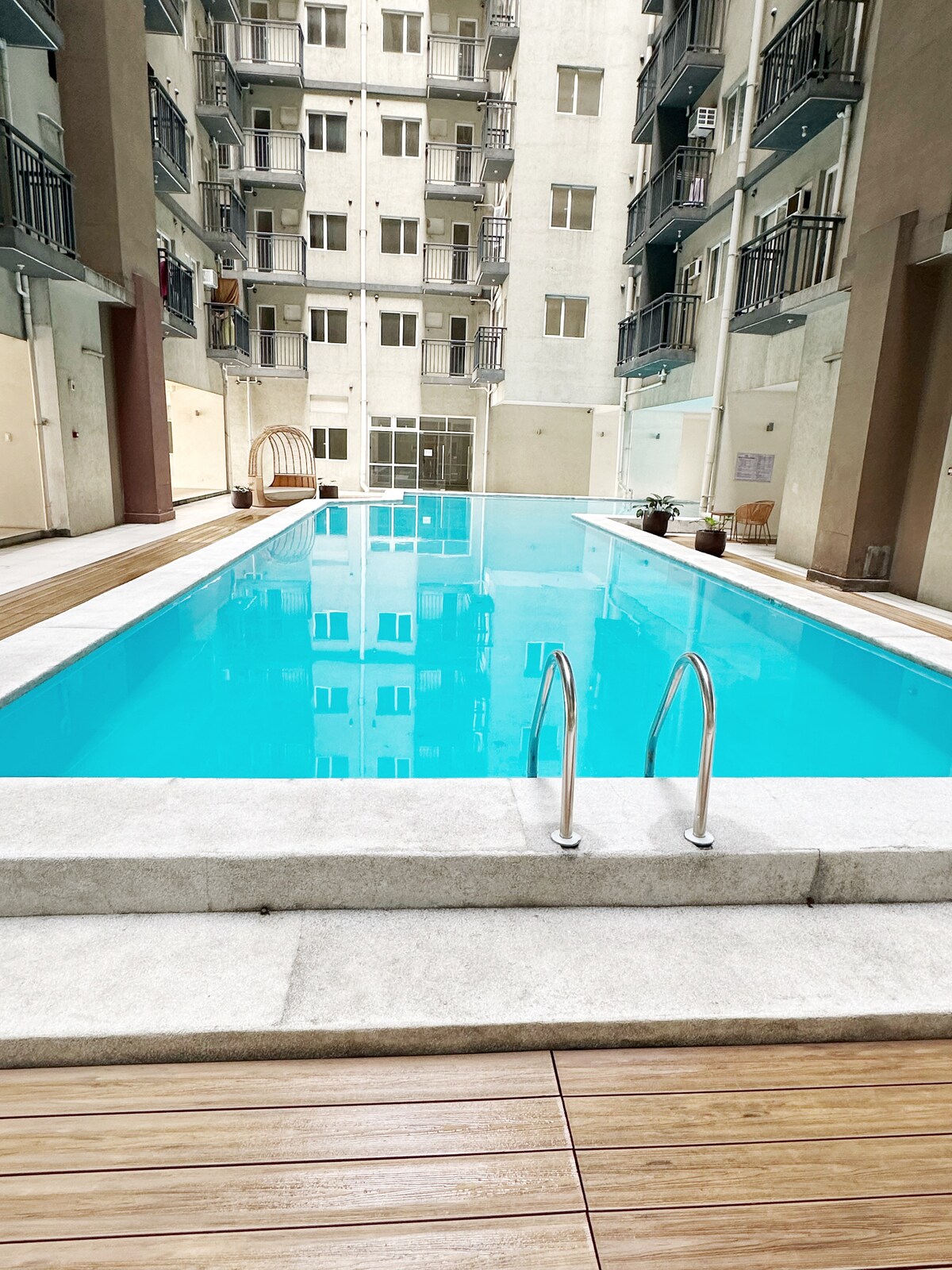 Studio unit with comfy double sized bed. The unit can accommodate up to 3 pax. It's equipped with Smart TV (Netflix, Cignal Cable TV and Youtube Ready), Bluetooth Videoke. You can do light cooking or order food at the food delivery of your choice. There's nearby Laundry Shop and convenience store inside the community.