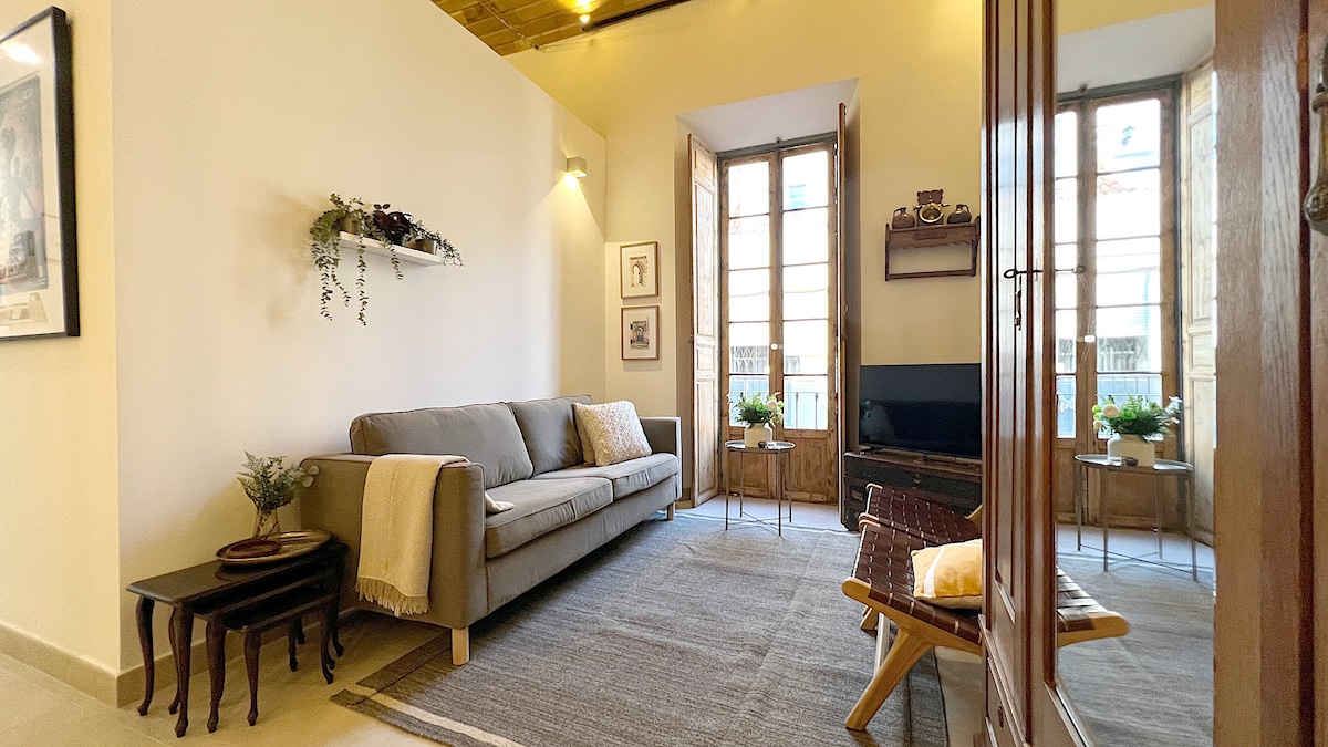 ⚠️ Due to nearby construction, you may experience some noise during your stay. Our duplex in the historic center faces the Picasso Museum and offers easy access to Malaga's main attractions. Shops, museums, restaurants, and city center beaches are all within walking distance. Located on two upper floors of a building with an elevator. The lower level features a fully equipped kitchen, dining area, and cozy living space. Upstairs is an open-plan bedroom with AC and access to a small terrace.