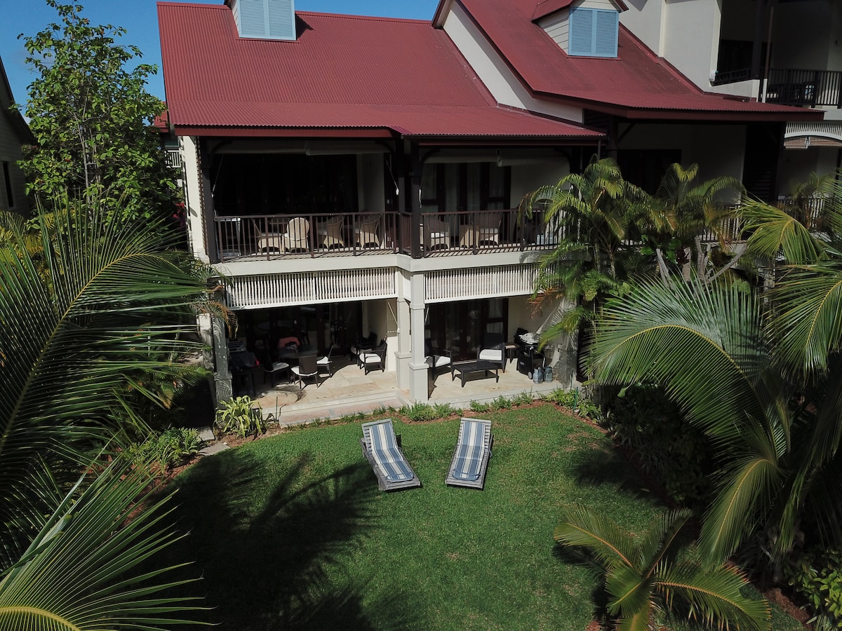 PATCHOULI RESIDENCES, EDEN ISLAND RESORT ENVIRONMENTAL TAX INCLUDED IN THE PRICE Luxury apartment, 125 m2, 2 bedrooms for 5, ground floor with a nice private garden. Exceptional view, located in the quiet inner basin, the best place on Eden Island. An electric car golf at your disposal, 2 minuts to go to: 4 beaches and 3 swimming pool, 8 restaurants, 6 bars, supermarket Unlimited Internet, LCD TV, 50 TV channels, BBQ, etc... 3 Kayaks available with the apartment. 3 sun bed in the garden.
