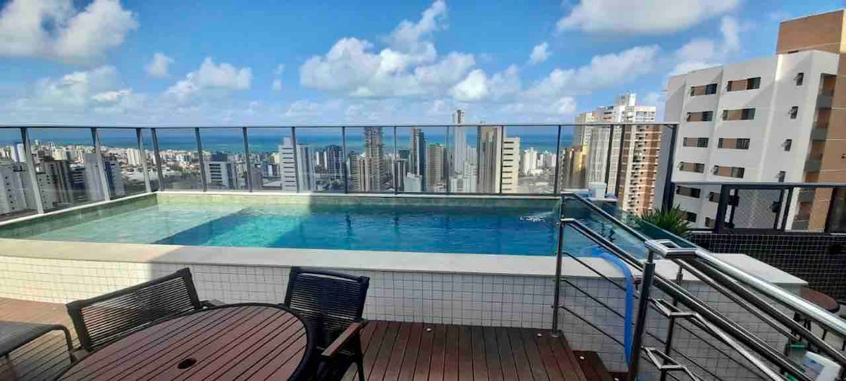 New apartment, fully equipped for your good stay and with air-conditioning in all rooms, super ventilated, on the 16th floor with a view from your bedroom window to the sea and 2 full beds inside the room. Located next to Shopping Manaíra, just a 5-minute walk. Located just a 15-minute walk from Manaíra Beach. Building with a fitness center, and a wonderful swimming pool and barbecue area on the top floor with a view of the sea where the sun rises first in all of Brazil.