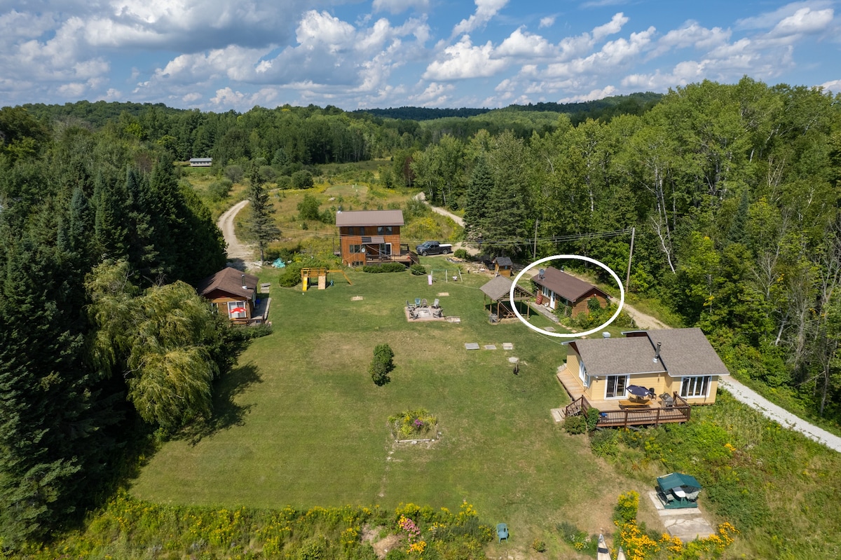 Cozy cottage on the hill overlooking the lake with a living space that offers a unique vibe with it's cathedral ceiling, fireplace, and floor to ceiling windows. Newly renovated bathroom. The two bedrooms accommodate 4 guests comfortably. We have high-speed wireless internet, satellite and Roku TV. All essentials supplied. Hiking, bicycle, ATV and sled trails along with ski hills are all within short driving distance. Your dog is welcome here! Winter tires needed on snowy days.