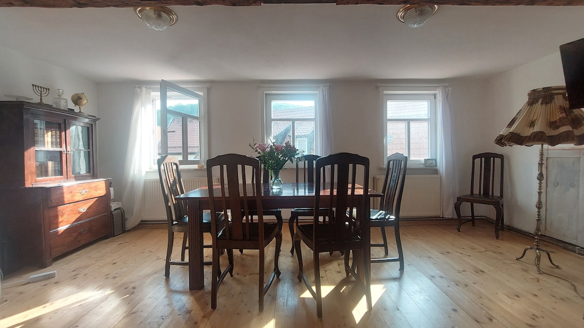 The Herrmannshof in Uftrungen! Since 1795. We have converted the former granary/hayloft on our four-sided farm into an apartment/rooms. 4 double rooms including shower/toilet/TV. Large separate lounge with radio/TV, dining area and free Wi-Fi as well as a fully equipped kitchen.
