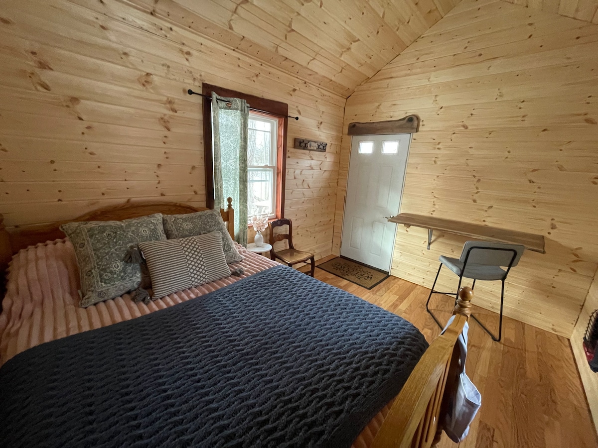 This private space is quietly tucked away in a stand of pines in the woods alongside Bryant Hill Creek. A wall of windows brings nature and natural light pouring into the space, and a fully-equipped kitchen and European bathroom provide modern comfort. Less than 4 miles outside of E-ville, it comfortably sleeps 2 adults and offers a chic and romantic setting for a couple to hide away with easy access to downtown. 4x4 a must in the snow, or simply park at the foot of the driveway. Tv & wifi.