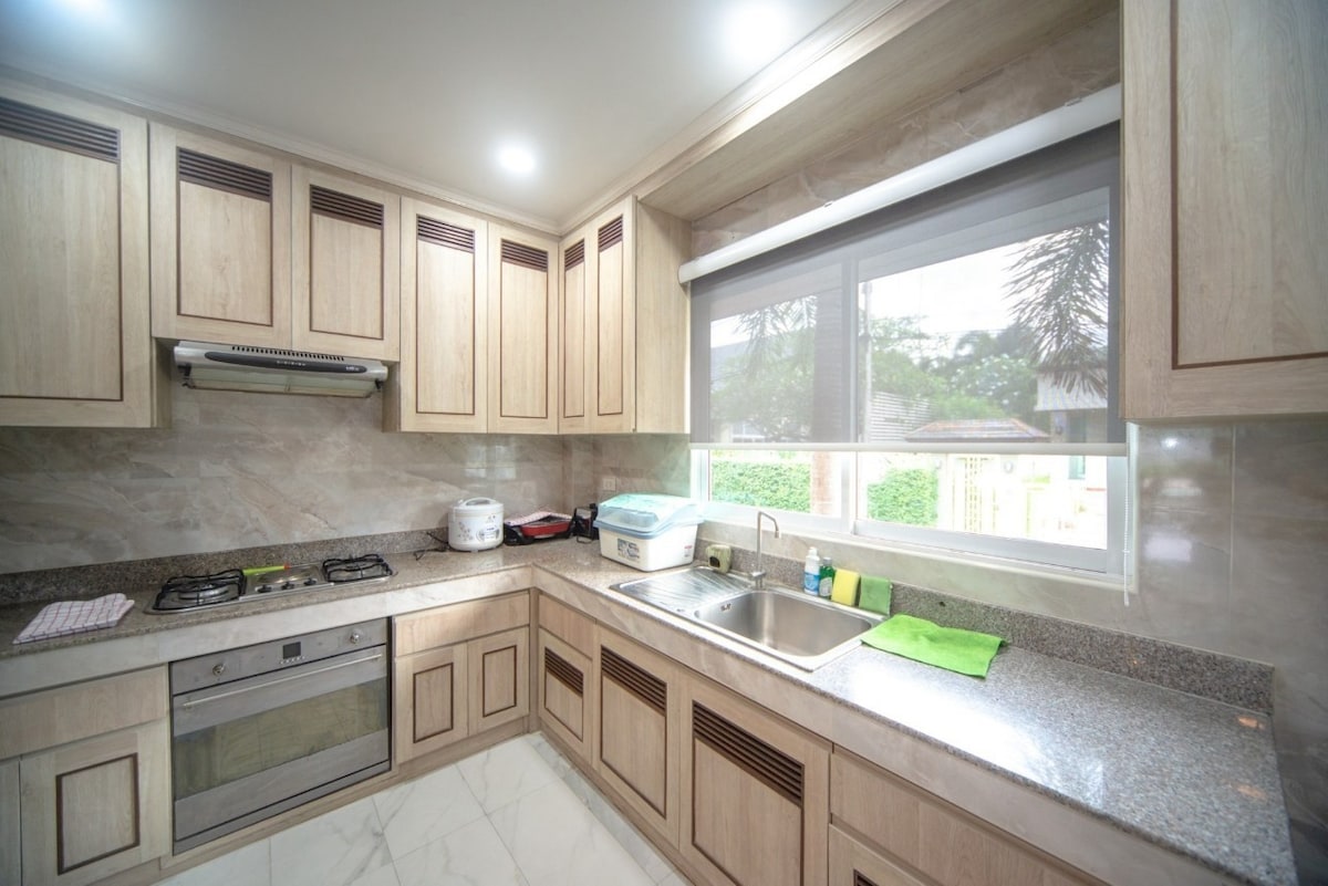 🏡TW Pool Villa – Modern Luxury Style Welcome to TW Villa, a holiday space that combines modern comfort with exquisite design. Whether it's a family reunion or a gathering of friends, it's a comfortable and memorable stay. ✨ Cozy space Single story villa with a floor area of about 160 sqm, 4 bedrooms and 5 bathrooms. Each bedroom has its own bathroom, plus a guest bathroom. The layout is reasonable and the stay is more comfortable. 🛏 Bedroom Configuration Three of the four bedrooms have 1.8m beds and one has a 1.5m bed to meet different needs, suitable for families or friends to share a good time. 🍳 Kitchen and Dining Fully equipped kitchen with full cooking equipment for easy cooking and home-like convenience and warmth. 🏊 Private Pool The villa has a private swimming pool with clear water, making it the perfect place to enjoy coolness and relaxation. Cleaning services are provided three times a week to ensure a clean and comfortable environment. 🔥 Outdoor recreation The villa has a barbecue grill and a spacious outdoor gathering space, perfect for a fun party with family and friends. 📺 Entertainment Facilities Each bedroom has its own TV, the living room has a large screen TV, and the whole house has high-speed Wi-Fi, bringing a rich and convenient entertainment and connection experience. 🎨 Modern style The villa has a modern luxury design style, simple and elegant, both comfortable and elegant, making your holiday more comfortable.
