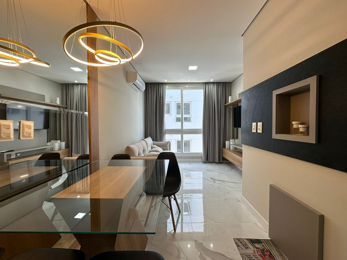 Relaxe neste espaço calmo e cheio de estilo, apartamento de 1 dormitorio com banheiro e box , completo não precisando trazer nada , wifi , cafeteira tvs smarts, maquina lava e seca , cama queem , sofá cama na sala e mais um colchão solteiro extra para ate 5 pessoas. Toalhas e roupa de cama etc... com terraço no predio com vista mar , serra e lago para aquele chimarão do dia. Com academia e Rooftop liberada. Não !! Permitido reserva e nem o uso do SPA e Sala de Festas para inquelinos !!