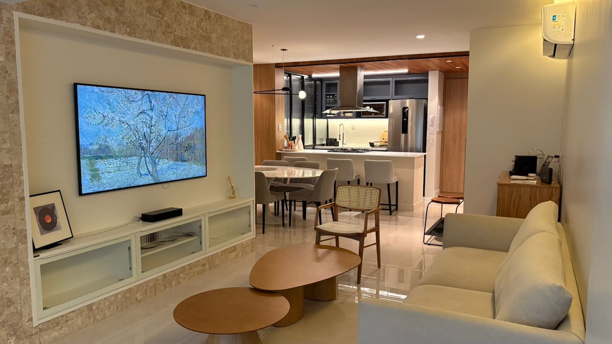 Welcome to our charming apartment located on the ground floor, full of style and fine finishing! No elevator or stairs are needed. This cozy space is fully equipped to make your stay memorable. Enjoy the comfort and convenience of the accommodation. Located in a condominium with a variety of amenities, such as barbecue grills, swimming pools, convenience, laundry and fruit shop. It accommodates up to four people, providing a cozy and relaxing experience.