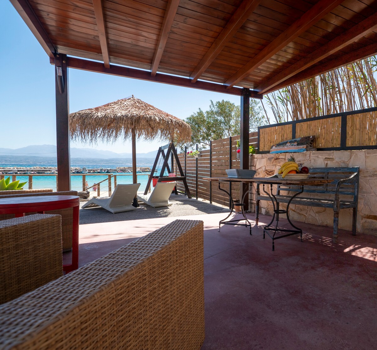 Relax with the whole family at this peaceful place to stay. In an environment harmonized in the natural landscape with modern comforts. Just 10 steps from the sea with a comfortable courtyard rich in vegetation and overlooking the sea and the traditional fish taverns offered by the area. The port a little further away offers a relaxing atmosphere for walking both day and night. A unique vacation experience, where nature meets culture and serenity meets adventure!