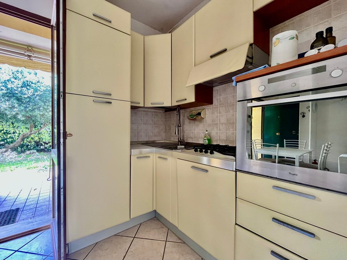 Two-room apartment with porch and small garden located in a complex of terraced villas. Equipped with a double bedroom with air conditioning, a living area with an equipped kitchen, table, sofa, bathroom and dressing room with washing machine. It has a private basement garage. The two-room apartment is about 300 meters from the center and 150 from the bus stop to the beaches. Very close to all amenities. Medium-sized pets are welcome. Tourist tax and cleaning included.