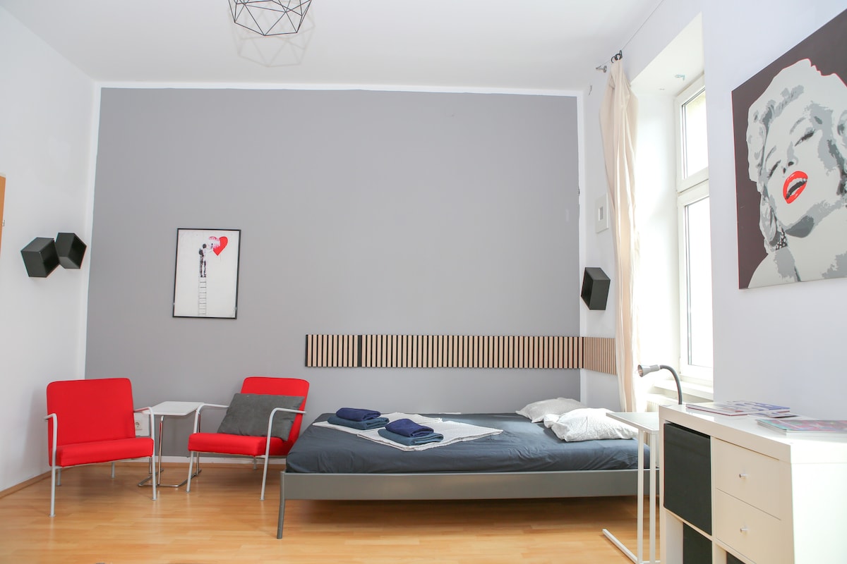 The entire apartment is carefully designed with unique pieces - the fully equipment kitchen will provide everything you might need during your stay. Facing a small inner yard it's completely quiet - yet very central in the lively 5th district in walking distance to Naschmarkt. The balcony (non-smoking) allows you to get some fresh air.