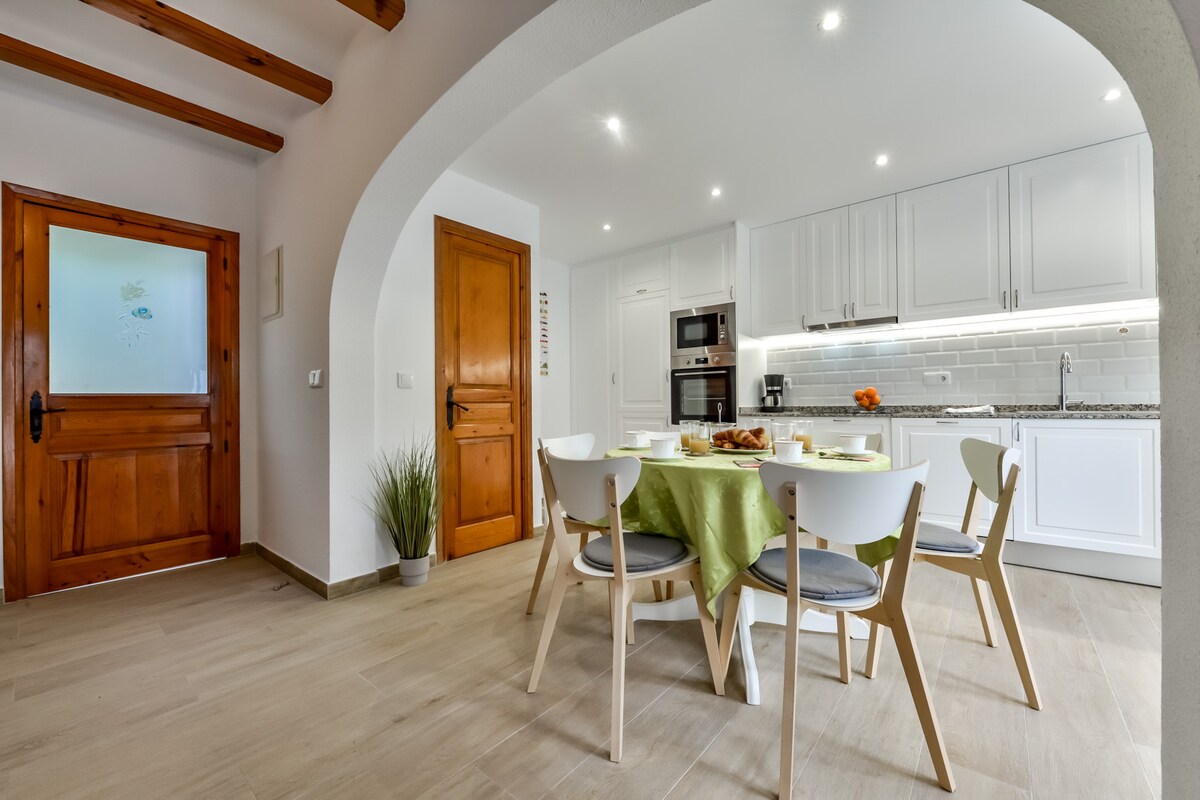 Semi-detached house fully refurbished in 2018 in a modern style, just a few meters from the sandy beach, bars, restaurants, pharmacy, and only 900 m from the village of Moraira. Enjoy sea views, a communal pool, high-speed fiber optic internet, air conditioning in all rooms, mosquito nets, Smart TV, dishwasher, and washing machine. Private terrace with gas barbecue, table, six chairs, and a parasol. Private parking space within a gated community. Friendly and reliable English-speaking host.