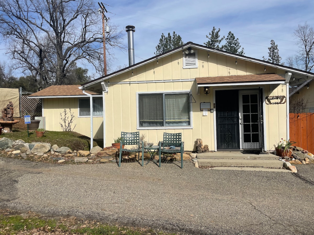 Shambala - "place of peace and tranquility" - a jewel in the Sierra Foothills on seven acres of magnificent oaks and pines. This one-bedroom cottage sleeps four -- queen bed in the bedroom, comfortable queen sofabed and futon in the living room, full kitchen, smart TV, Wi-Fi, work desk, big windows looking out onto the woods, wraparound deck for lovely outdoor dining. A magical retreat - wildflowers in the spring, a seasonal creek, a dusting of snow in winter - Shambala is your Yosemite secret.