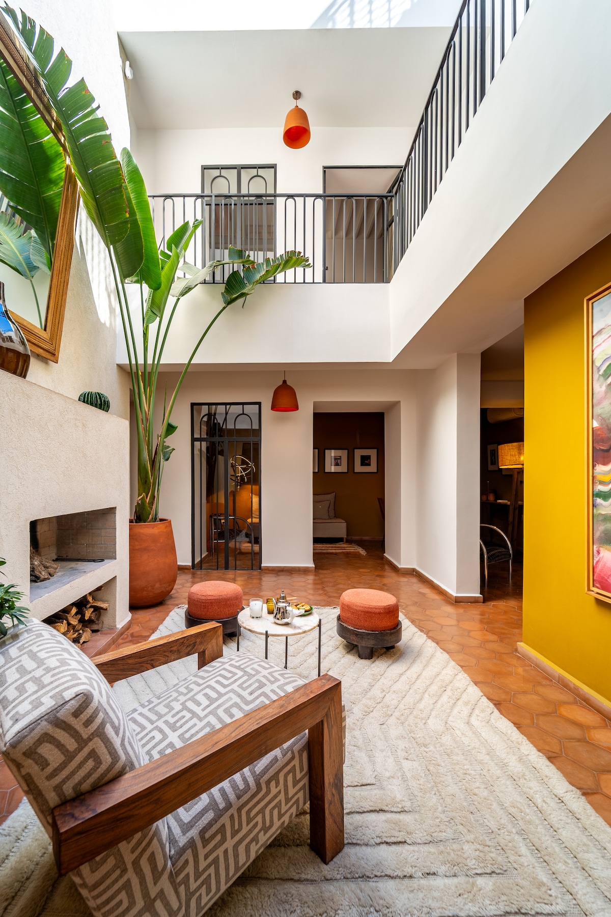It is a small riad in the heart of the Medina of Marrakech, completely rebuilt in place of a pre-existing ruin. It consists of an entrance, living room with fireplace, dining area, kitchen and bathroom on the ground floor, all rooms are arranged around the patio. On the first floor, there is a double bedroom, a large bathroom, and a hallway with the possibility of a third bed. On the third level, there is a terrace equipped with seating and a breakfast table.