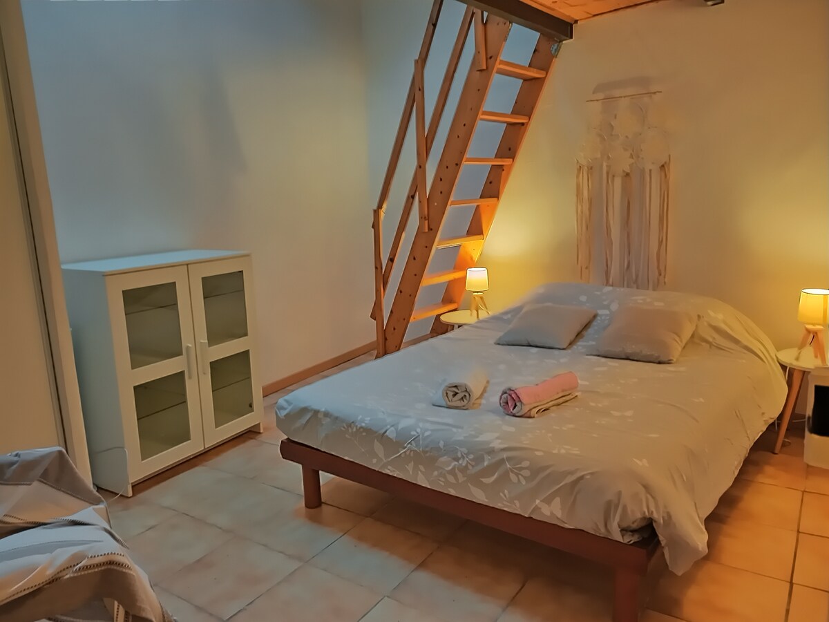 Take it easy at this unique and tranquil getaway. apartment located in Marsillargues, in a charming village located 15 minutes from the beaches (Grau du Roi, La Grande-Motte…) totally independent, located in a property. It is composed on the ground floor of a living room, equipped kitchen and shower/toilet. Upstairs is a large bedroom with a SPA area (professional). You will have an outdoor area of about 40 m2. 1 secure parking space