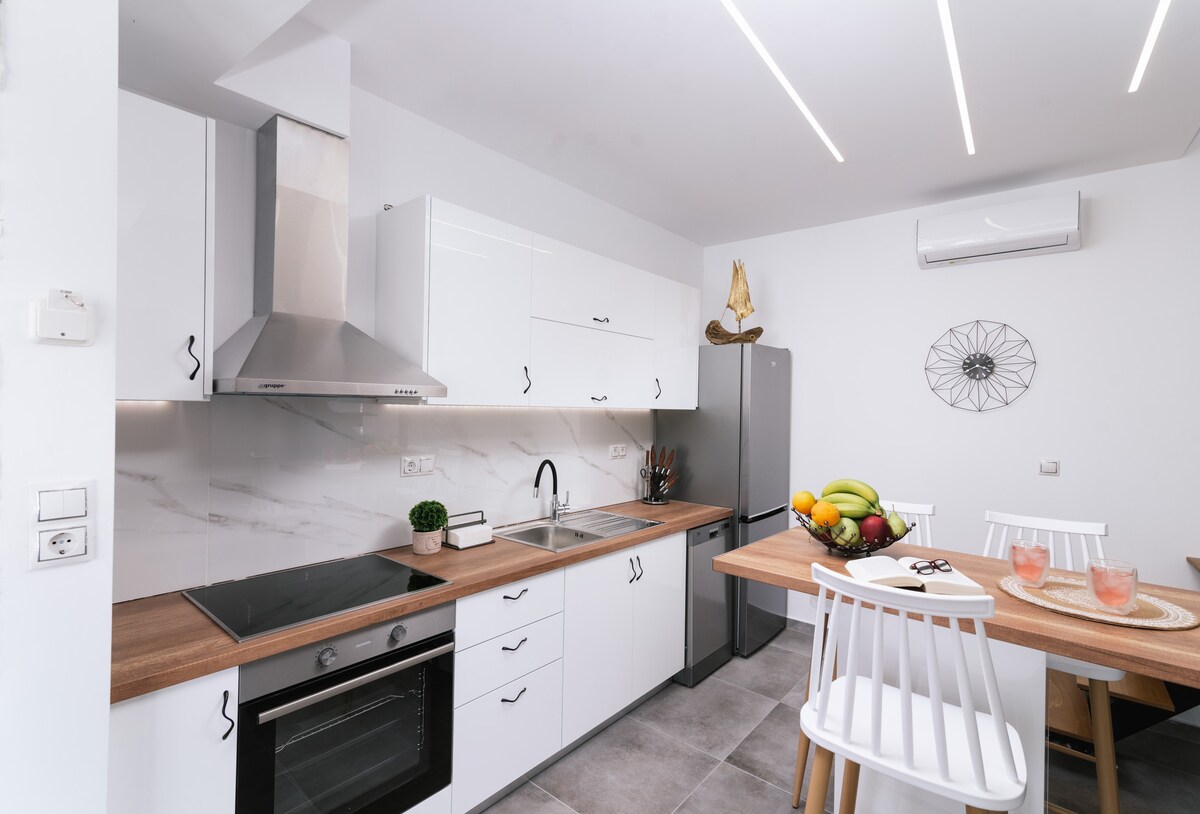 Luxury apartment with sea view of the Venetian fort "Koules" and the old port. Modern and elegant spacious and shiny two bedroom apartment in the heart of the city, within walking distance of all major attractions, historical sites, restaurants, shopping and night life that the city has to offer. Its unique location, smart design with the highest standards provide a comfortable home and a great experience for all guests.