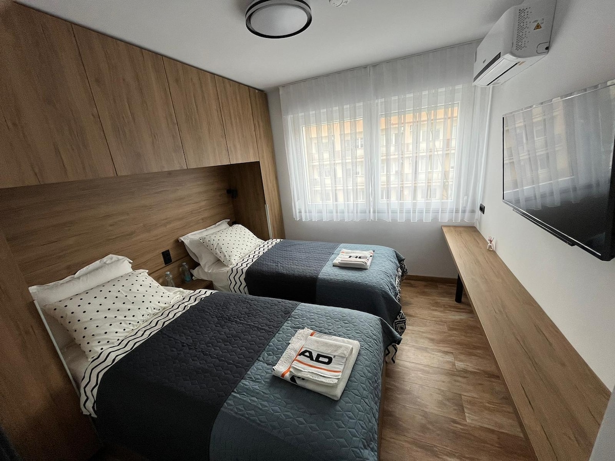 Stay cool with our new air conditioner! In the heart of Prishtina, just 10 mins from the main square, this bright apartment has a large terrace with city views, two modern bathrooms, three cozy beds, a fully equipped kitchen, and a spacious living room with comfy sofas and a 42" TV with Smart Box (Netflix,Hulu,Music) Perfect for relaxing, exploring, or working remotely in comfort and style!