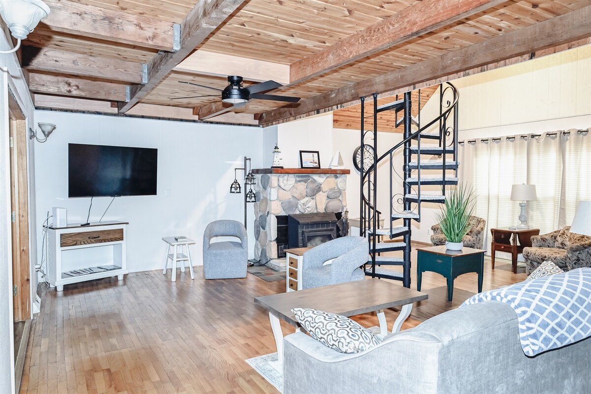 Lakefront Strawberry Haus has three bedrooms to sleep 10-12, including 2 on a futon and 2 on a sofa bed, providing the ultimate family getaway. The cozy interior provides a balance of comfort and amenities for endless entertainment! The covered deck and hot tub provide direct, protected access to the lakeside dock, equipped with kayaks and a paddle boat. The game room includes amenities such as a 420 game video console, shuffleboard/bowling table, toys, books, board and card games