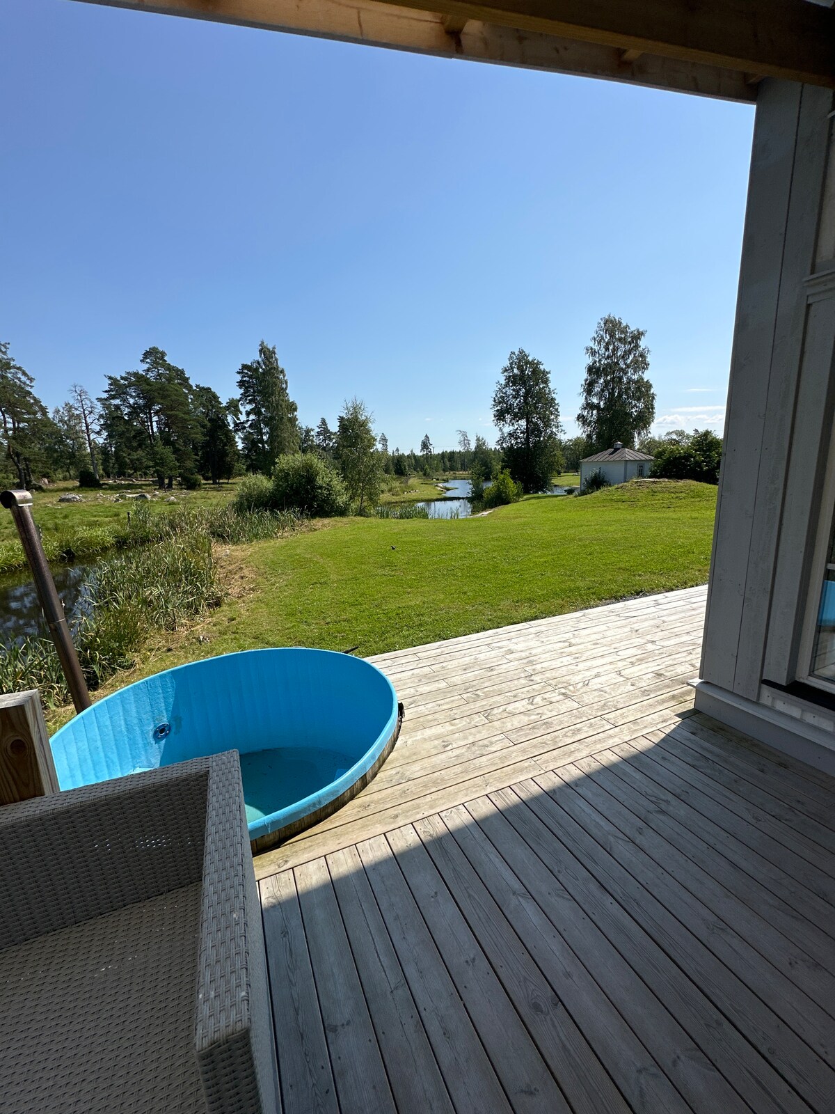 Kick back and relax in this calm, stylish space, a perfect place to enjoy the beautiful nature, far away from hectic life. Here you live in a modern newly built guest house of about 30 sqm + loft - a paradise on earth. Located in a small village by Hjälmaren - about 5 minutes' walk to the beach. There is a smaller private deck overlooking the forest and a large common deck with access to a shared pool, wood-fired hot tub, gas grill and wood-fired fireplace. The large house can also be rented.