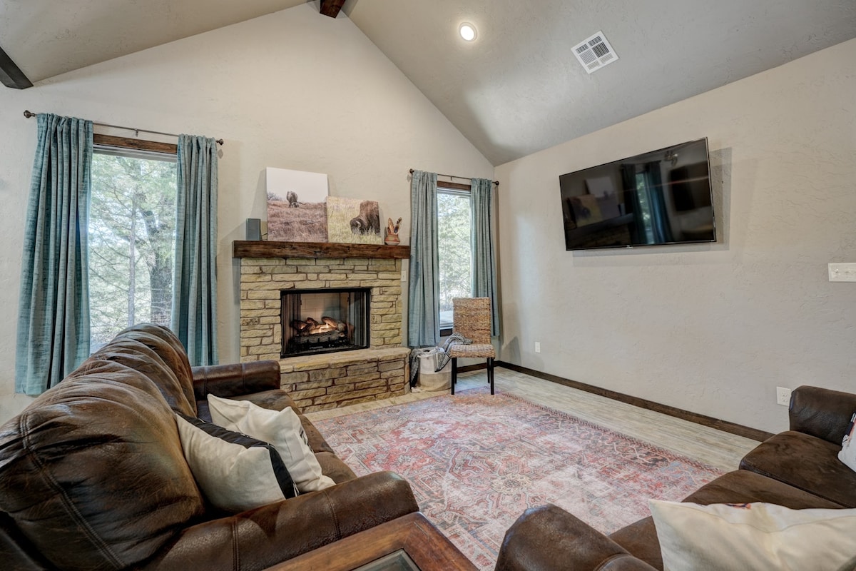 Nestled among the trees in Medicine Park is a cozy cabin with all the comforts you could desire. The cabin has two bedrooms, two bathrooms perfectly placed for maximum privacy. Medicine Park adjoins the Wichita Mountains and offers ; hiking, biking, fishing, kayaking, and bird watching. Sit back, relax and take in the fresh air or explore nearby trails for new adventures. This is the perfect place to unwind from your everyday routine and make lasting memories that you’ll treasure forever