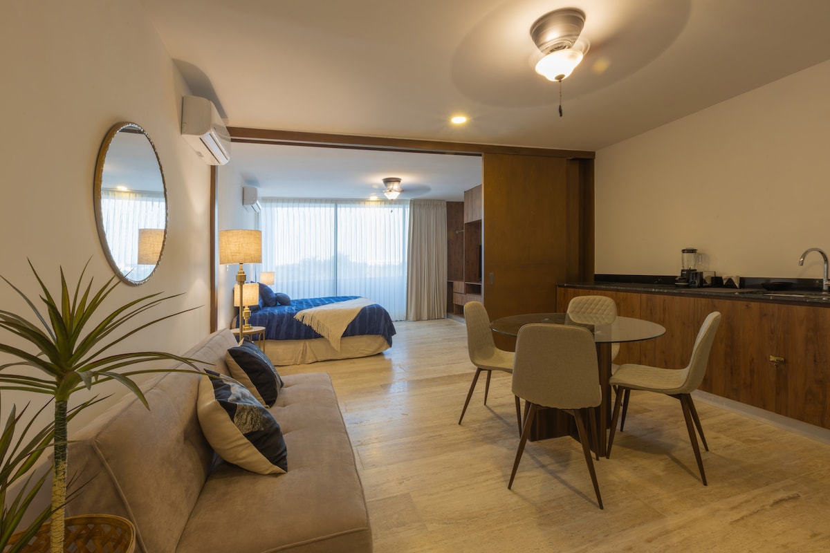 Modern Studio with Lake View in the neighborhood in Merida Enjoy this cozy and stylish studio apartment located on the north side of the city. It features a comfortable bedroom (king-size bed and A/C), a full-size sofa bed, a fully equipped kitchen, and a bathroom with amenities (towels, hairdryer, iron). Relax with a stunning lake view and access exclusive amenities within the building. Your stay will be comfortable and unforgettable!